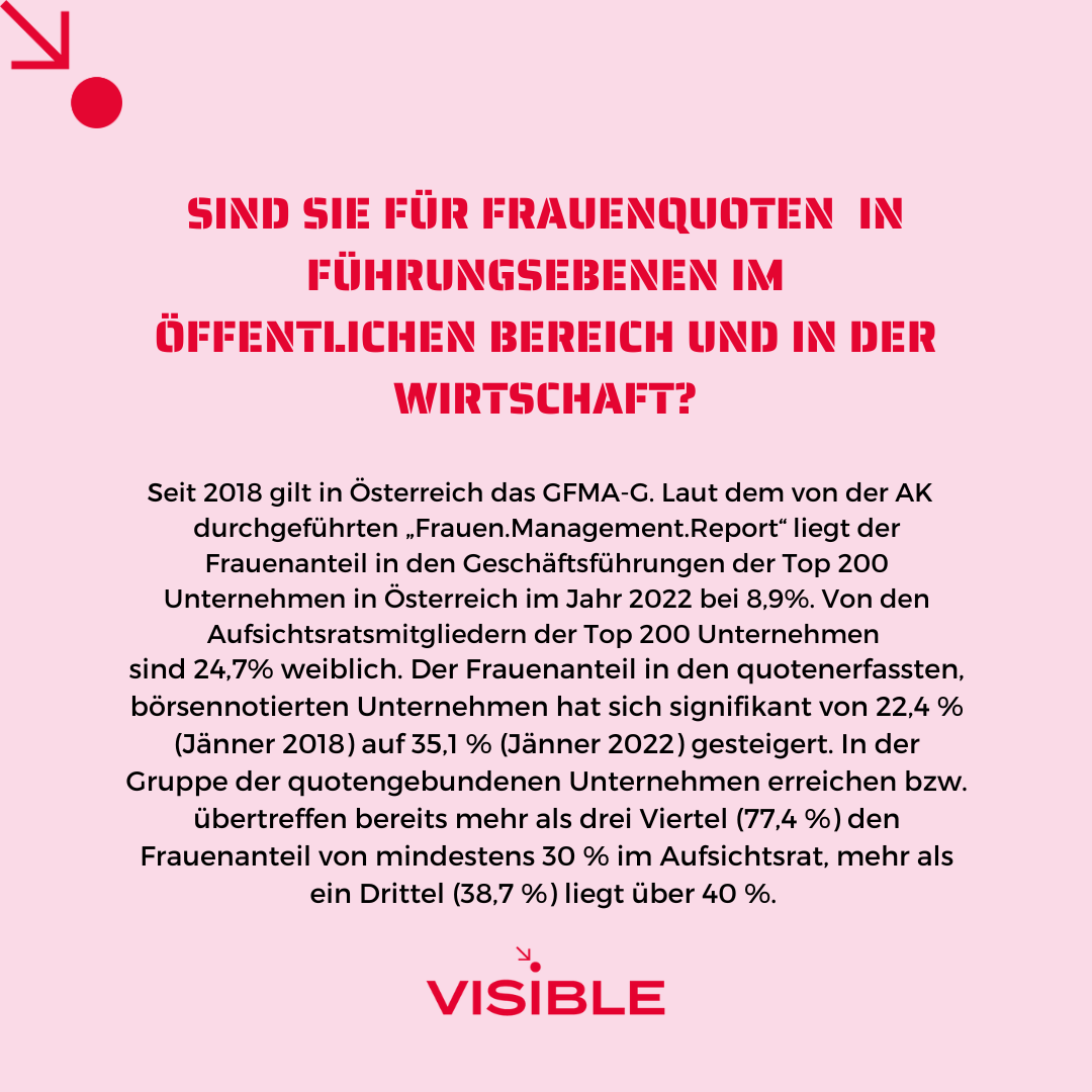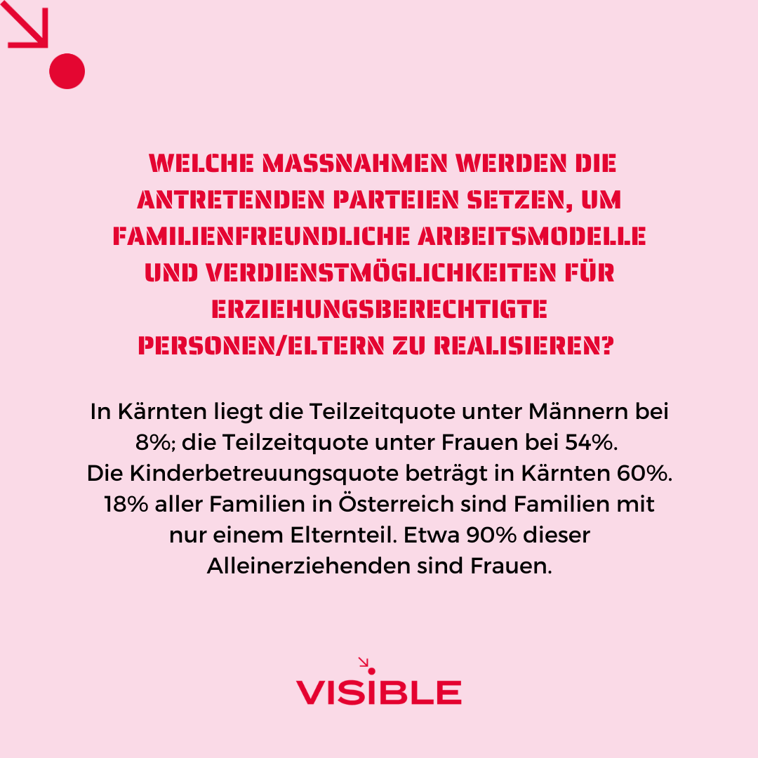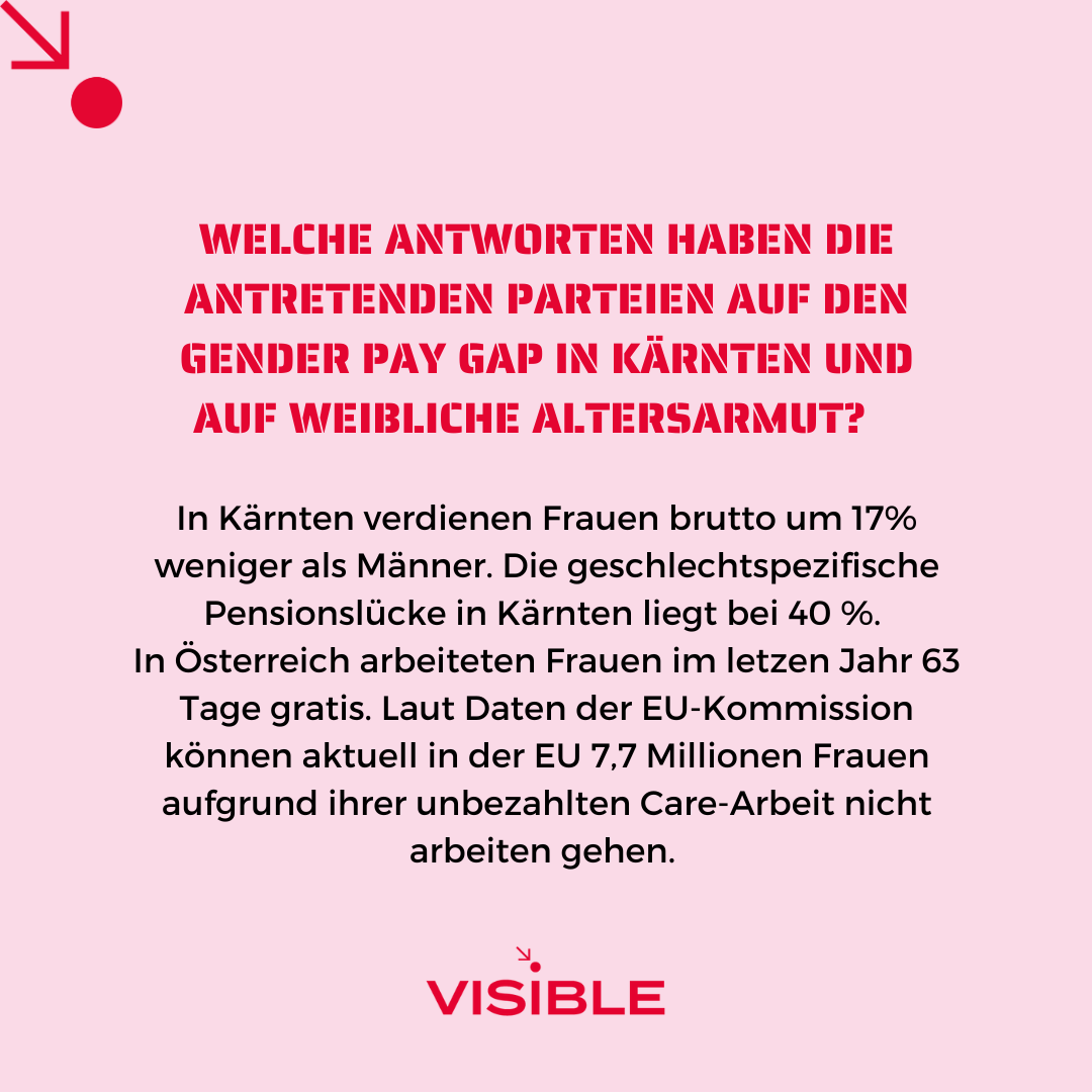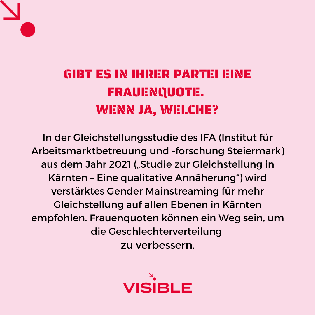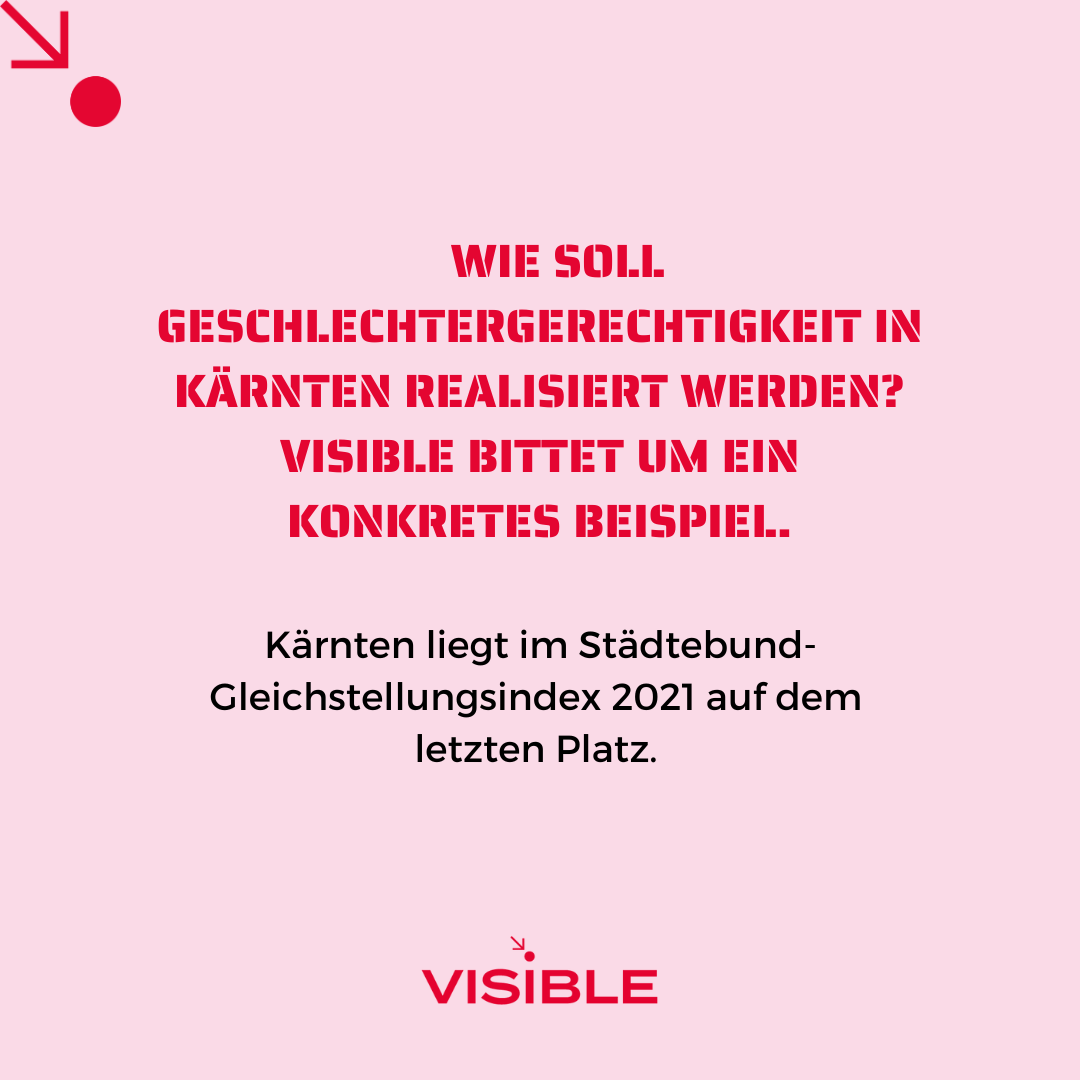 VISIBLE stellte den Parteien, die bei der Kärntner Landtagswahl 2023 antraten, 9 Fragen zu frauenpolitisch relevanten Themen. Die Ergebnisse werden im Rahmen einer Kleine Zeitung Außensicht präsentiert werden.