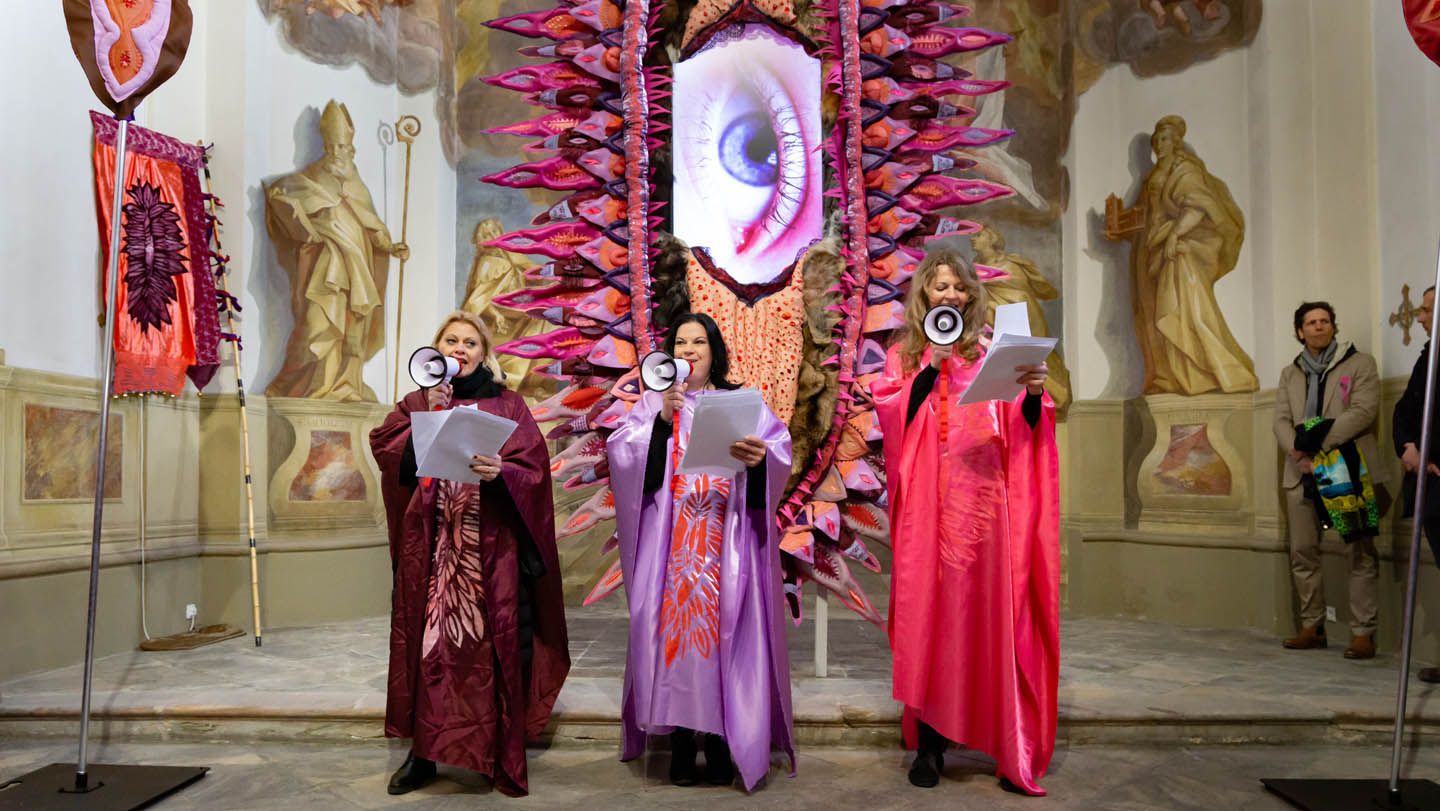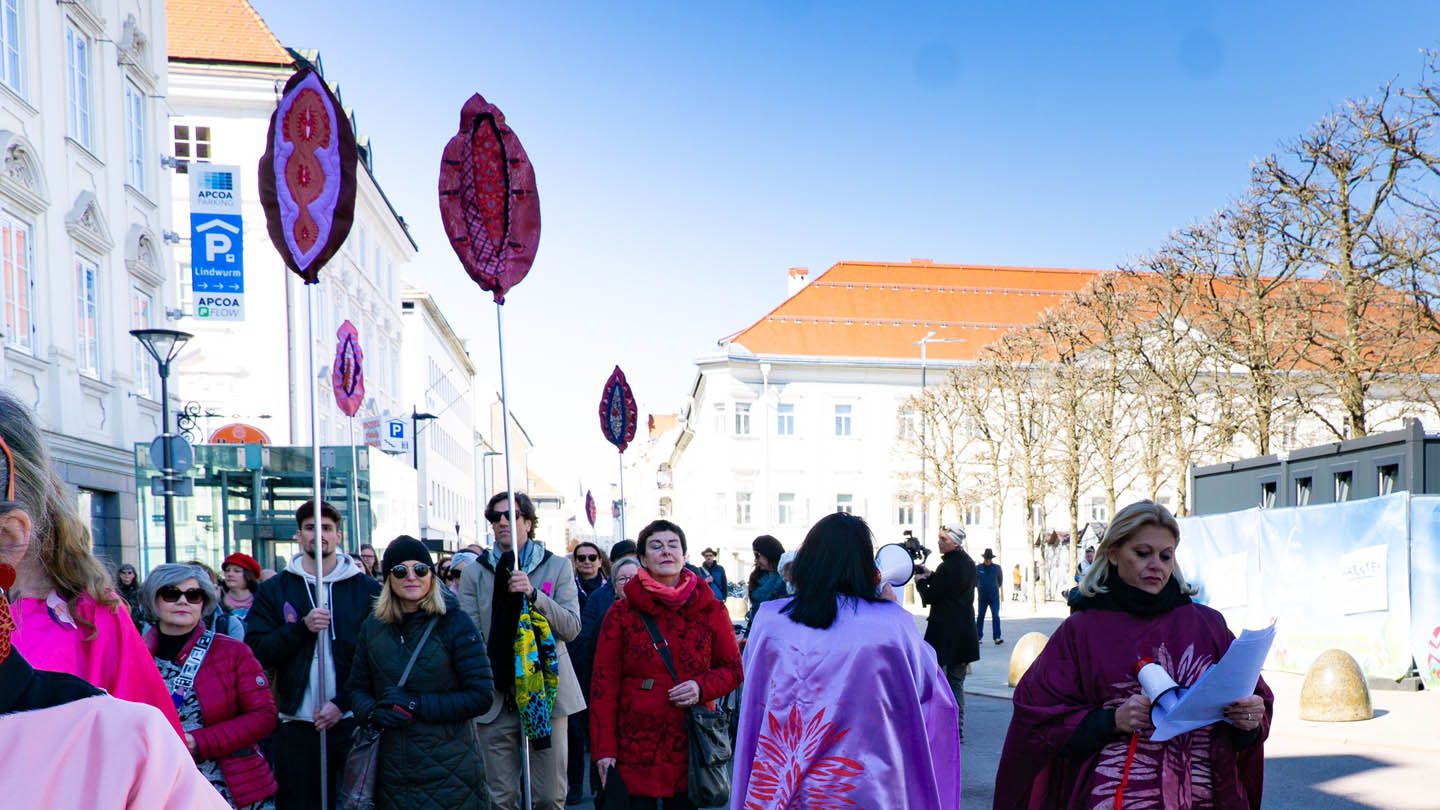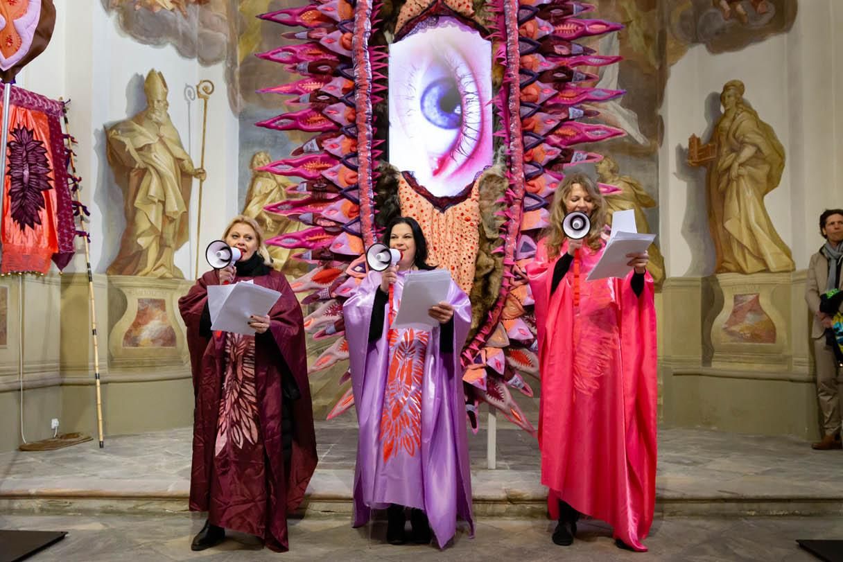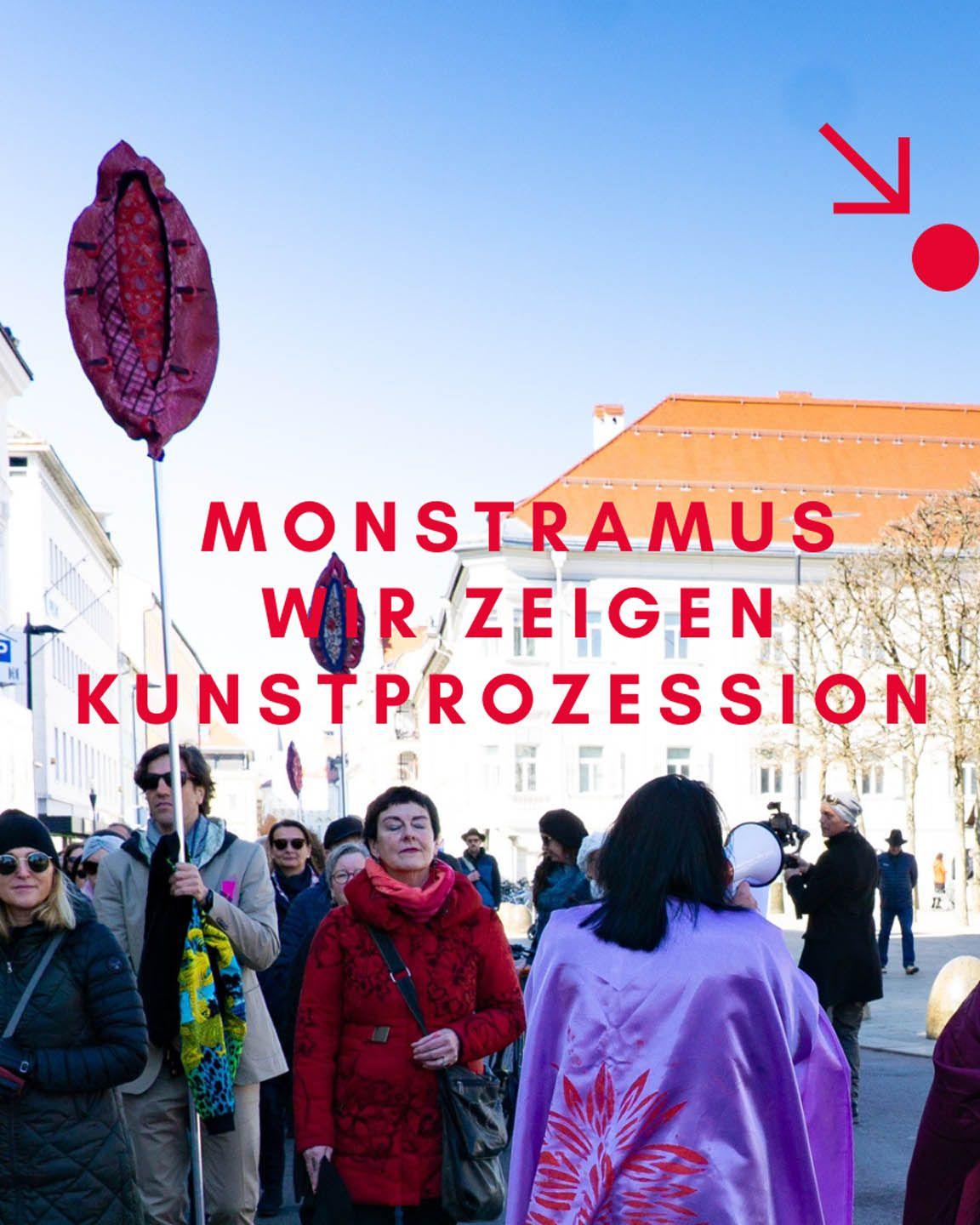 Ausgehend von der Installation „LINGUA – sprachlos“ der bildenden Künstlerin INA LOITZL (22.2. bis 7.4.2023 ausgestellt im Klagenfurter Dom) wird eine inszenierte Kunstprozession (Regie: Ute Liepold) von Katarina Hartmann, Magda Kropiunig und Sandra Pascal angeführt, die in einer Litanei Texte und Parolen zur Sichtbarkeit der Frau skandieren. Der Zug wird unterstützt von der Trommlerin Sarah Pletschko und von Passant*innen begleitet. Die feministische Prozession führt vom Klagenfurt Dom, über die Lidmanskygasse, 10.-Oktober-Straße, Postgasse und über den Neuen Platz und die Burggasse in den Burghof Klagenfurt. Dort findet die Performance „Missgeburt: Macht eine Messe!“ der Musikkapelle „gebenedeit“ rund um die Autorin und ehemaligen Stadtschreiberin Lydia Haider statt. Gemeinsam mit Josua Oberlechner und Johannes Oberhuber gibt sie antworten auf die komplizierten Fragen der Menschheit. In der Fastenzeit stehen dabei Buße und Reinigung im Zentrum. Danach wird die Prozession in die Burgkapelle des MMKK fortgesetzt, in der INA LOITZL ihre extra für die Burgkapelle angefertigte Textilinstallation „monstramus – wir zeigen“ erstmals präsentiert (19.3. bis 28.5. 2023 ausgestellt in der Burgkapelle).