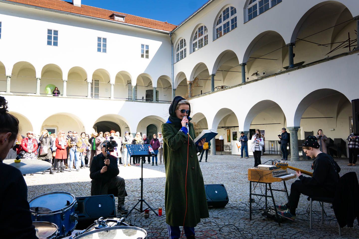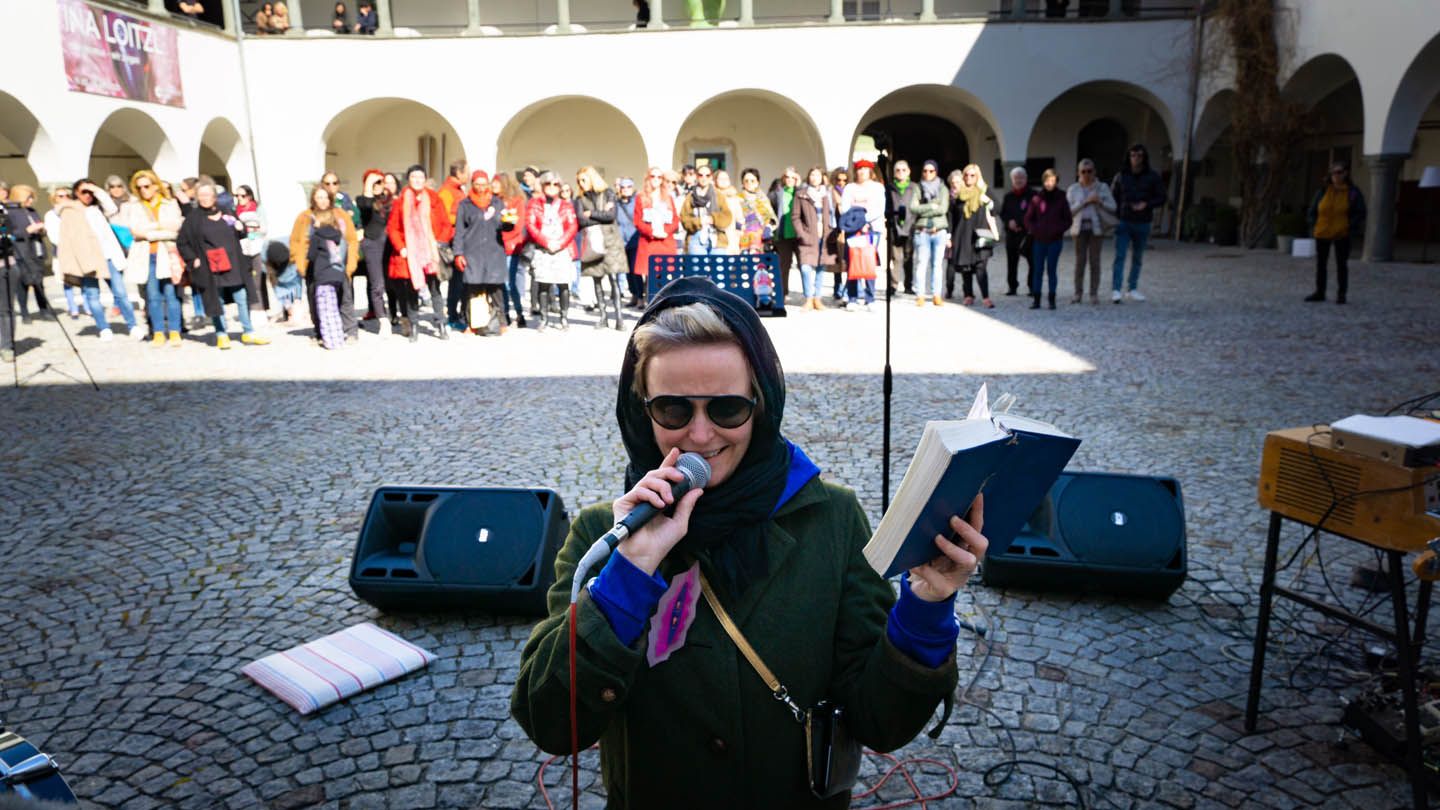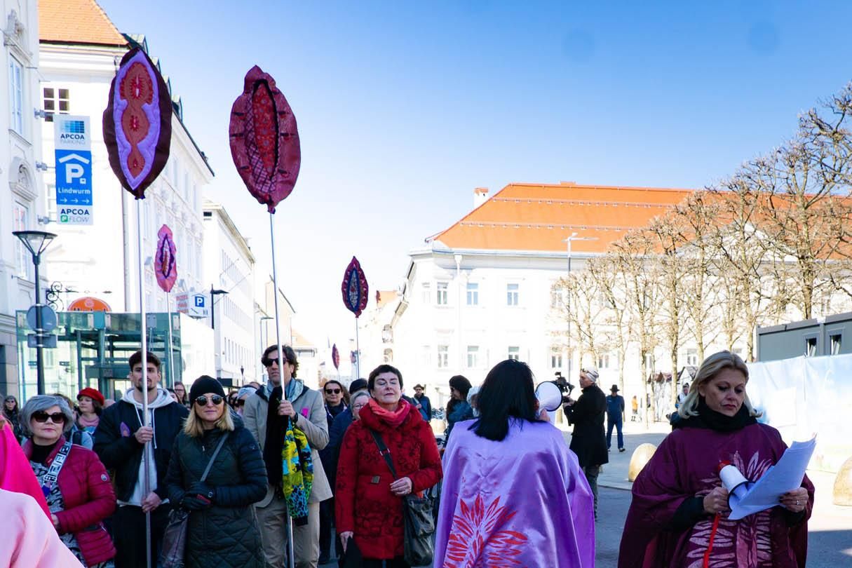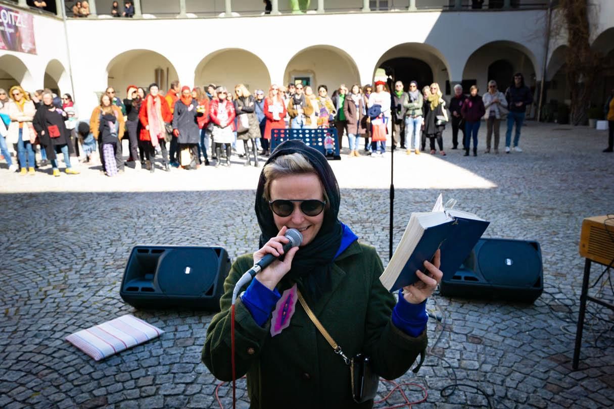 Ausgehend von der Installation „LINGUA – sprachlos“ der bildenden Künstlerin INA LOITZL (22.2. bis 7.4.2023 ausgestellt im Klagenfurter Dom) wird eine inszenierte Kunstprozession (Regie: Ute Liepold) von Katarina Hartmann, Magda Kropiunig und Sandra Pascal angeführt, die in einer Litanei Texte und Parolen zur Sichtbarkeit der Frau skandieren. Der Zug wird unterstützt von der Trommlerin Sarah Pletschko und von Passant*innen begleitet. Die feministische Prozession führt vom Klagenfurt Dom, über die Lidmanskygasse, 10.-Oktober-Straße, Postgasse und über den Neuen Platz und die Burggasse in den Burghof Klagenfurt. Dort findet die Performance „Missgeburt: Macht eine Messe!“ der Musikkapelle „gebenedeit“ rund um die Autorin und ehemaligen Stadtschreiberin Lydia Haider statt. Gemeinsam mit Josua Oberlechner und Johannes Oberhuber gibt sie antworten auf die komplizierten Fragen der Menschheit. In der Fastenzeit stehen dabei Buße und Reinigung im Zentrum. Danach wird die Prozession in die Burgkapelle des MMKK fortgesetzt, in der INA LOITZL ihre extra für die Burgkapelle angefertigte Textilinstallation „monstramus – wir zeigen“ erstmals präsentiert (19.3. bis 28.5. 2023 ausgestellt in der Burgkapelle).