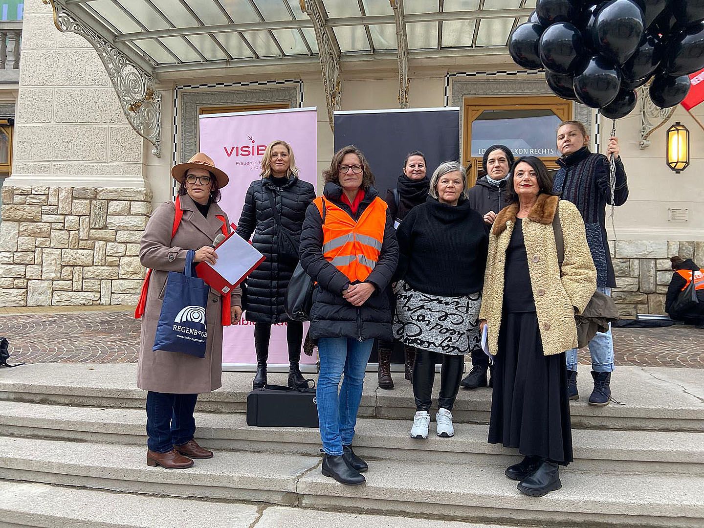 Ute Liepold, Martina Gabriel und Estha Sackl eröffneten den Marsch vor dem Stadttheater Klagenfurt. Jede von ihrem Mann getötete Frau hat einen Namen. Für jedes Opfer haben wir einen schwarzen Luftballon in den Himmel steigen lassen.